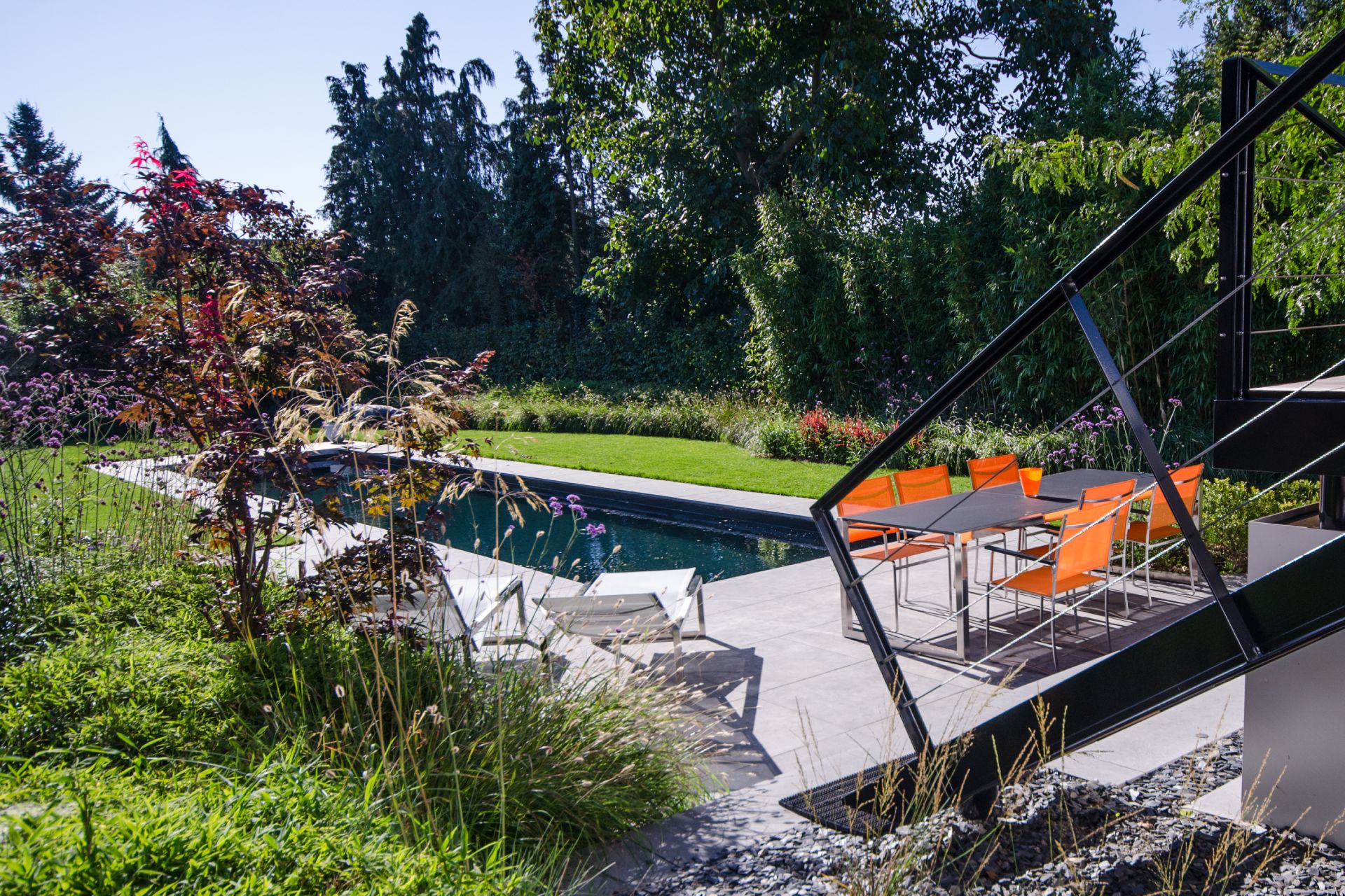 Afin de dissimuler leur zone de détente de la vue des voisins, nous avons choisi d’installer de hauts bambous ainsi qu’une haie de charme pour structurer les plantations. Sur les contours du gazon, nous avons installé des massifs de graminées ainsi que quelques plantes vivaces colorées pour apporter de la texture et de la légèreté. Un Koelreuteria, arbre multi-tronc très graphique, a été planté dans le fond du jardin.