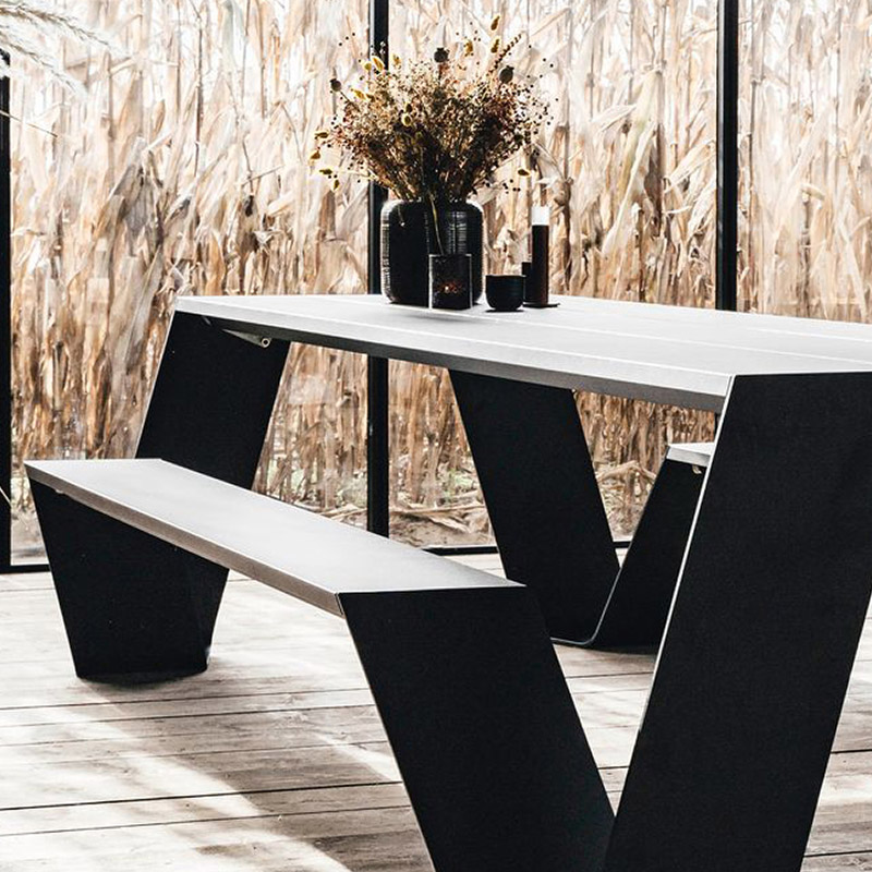 Une interprétation unique nouvelle d’un concept classique : La table de pique-nique avec ses pieds incurvés éliminent toute difficulté de s’installer.